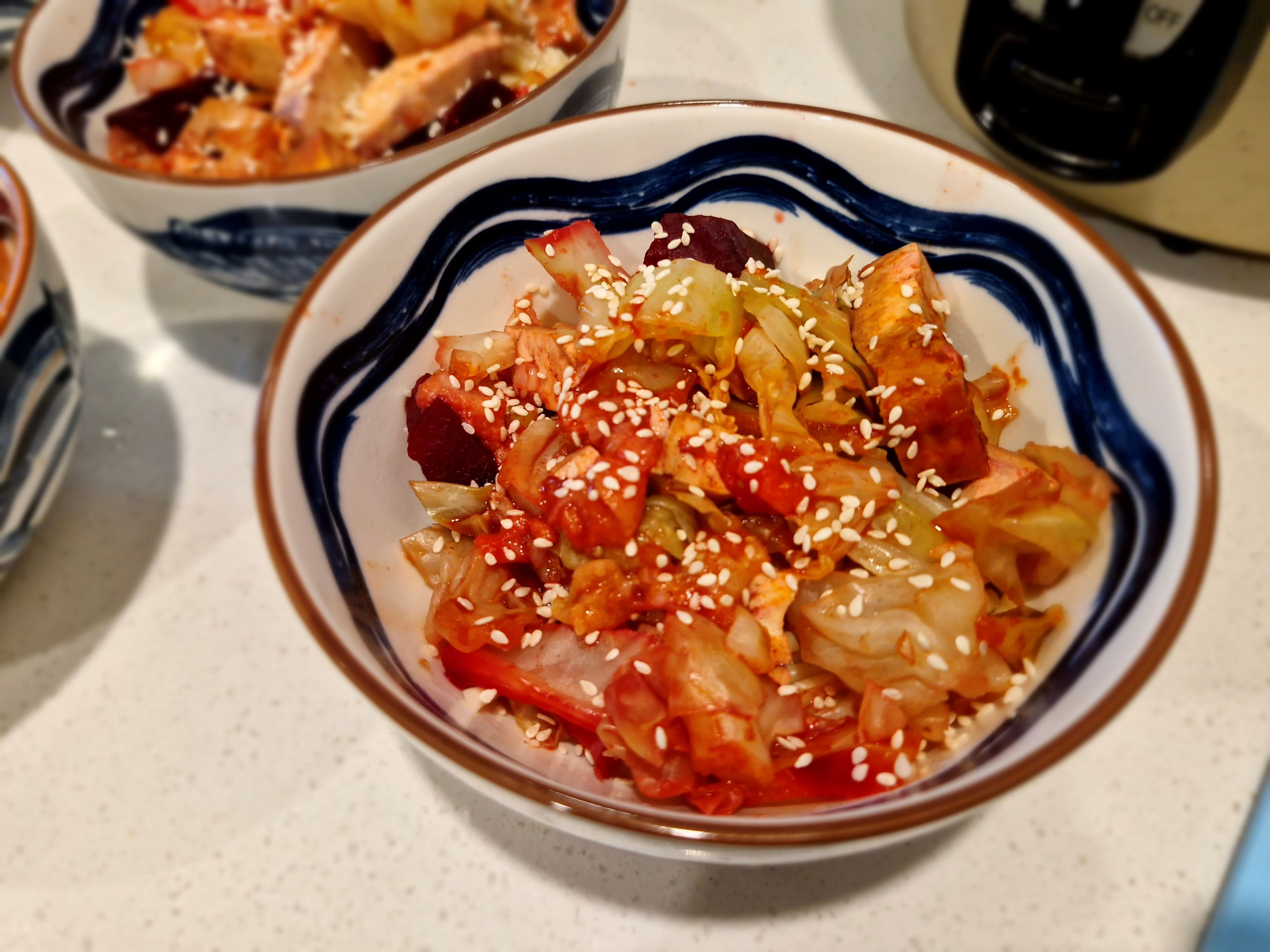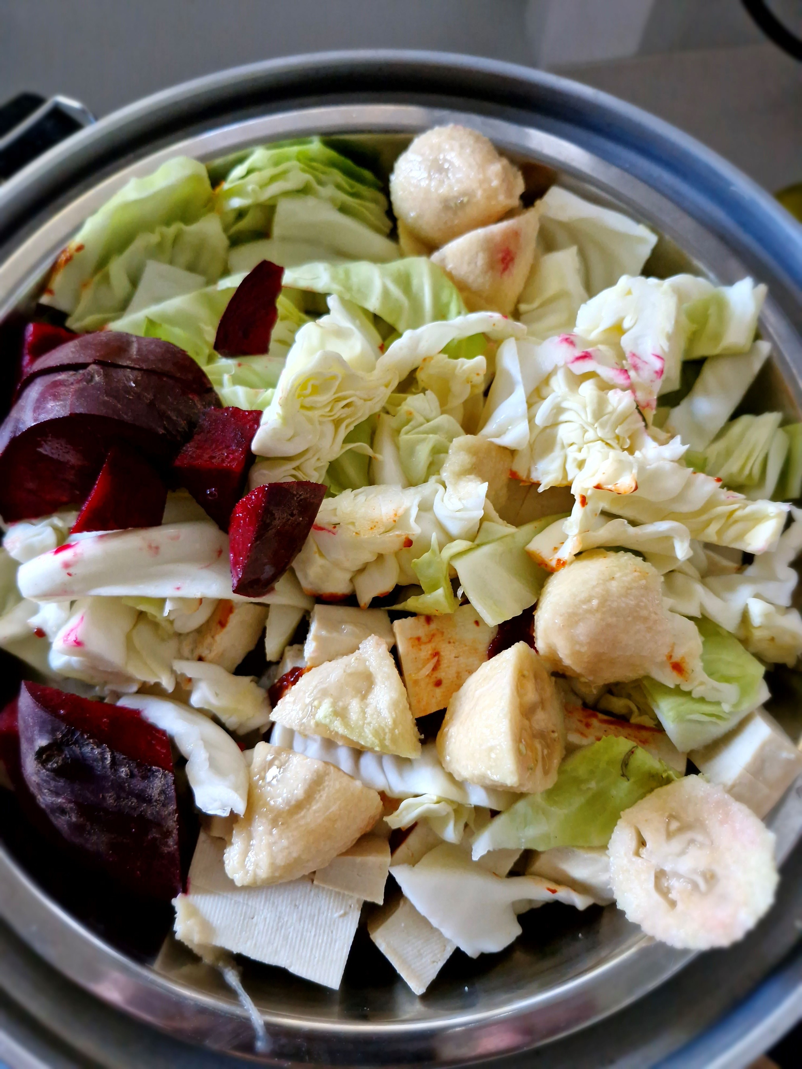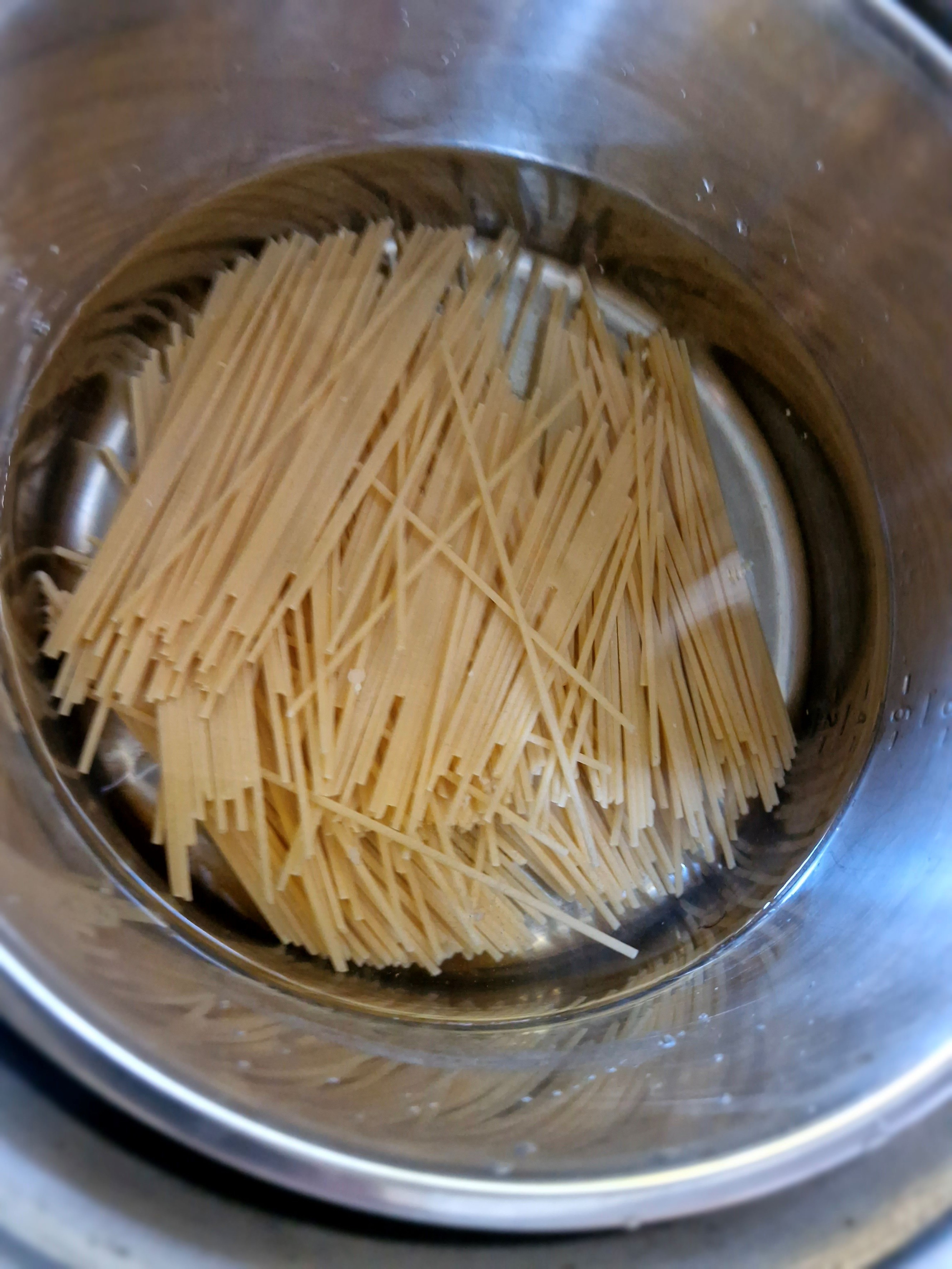 So easy to make a quick dinner with the Pasta cooking in the inner bowl and on top with the shallow bowl the veggies with tofu, feijoas and chilli paste.  So tasty!
