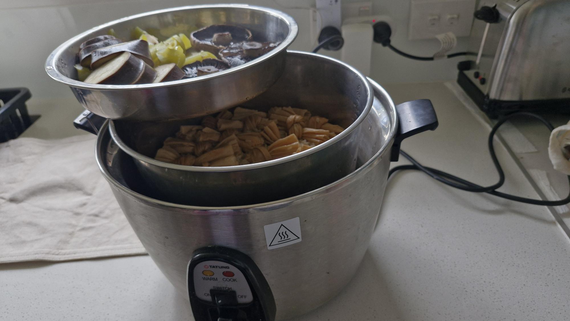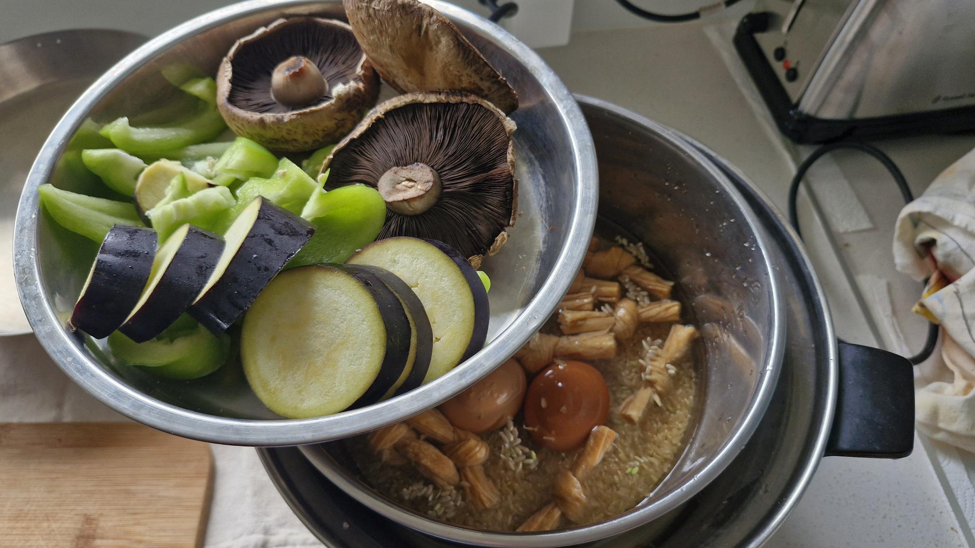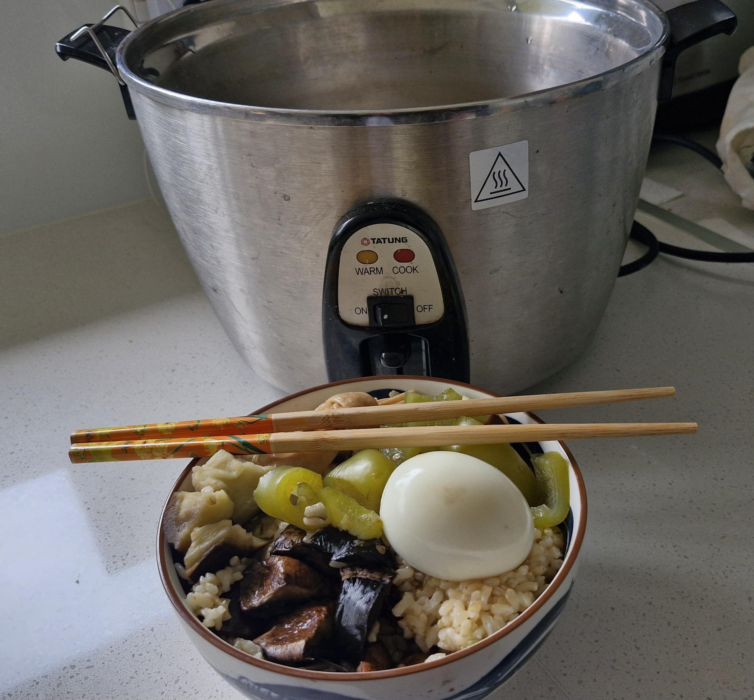 Need to cook dinner and not worry about it? Full of protein - eggs, brown rice and tofu in the inner bowl and then capsicum, eggplant and mushrooms in the shallow bowl, so easy!