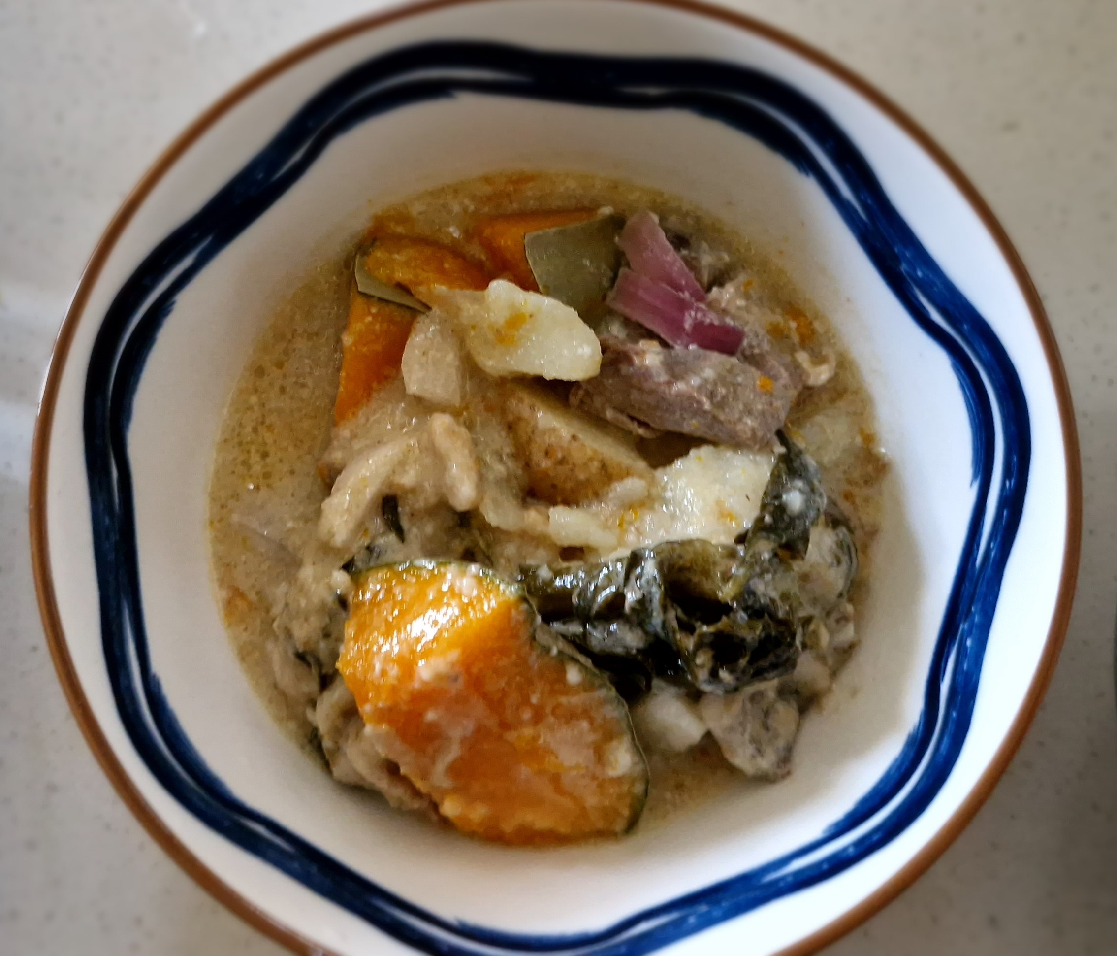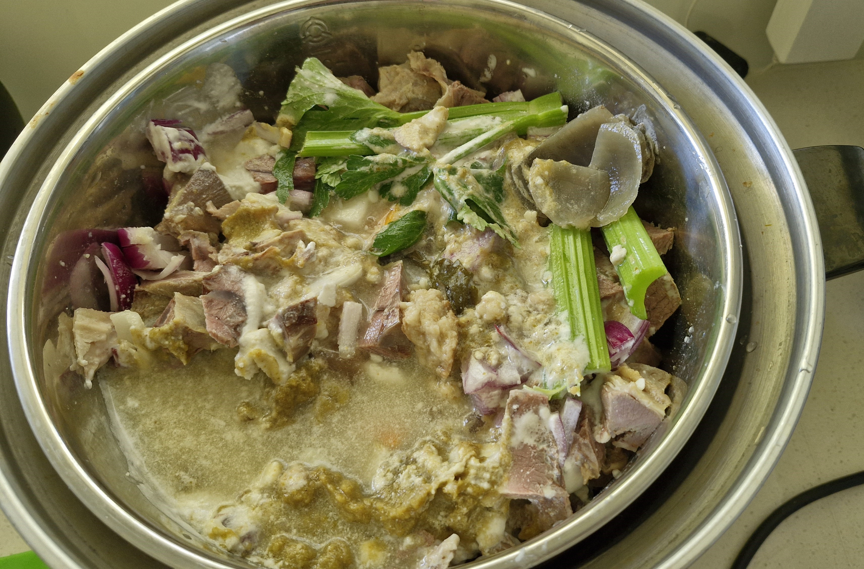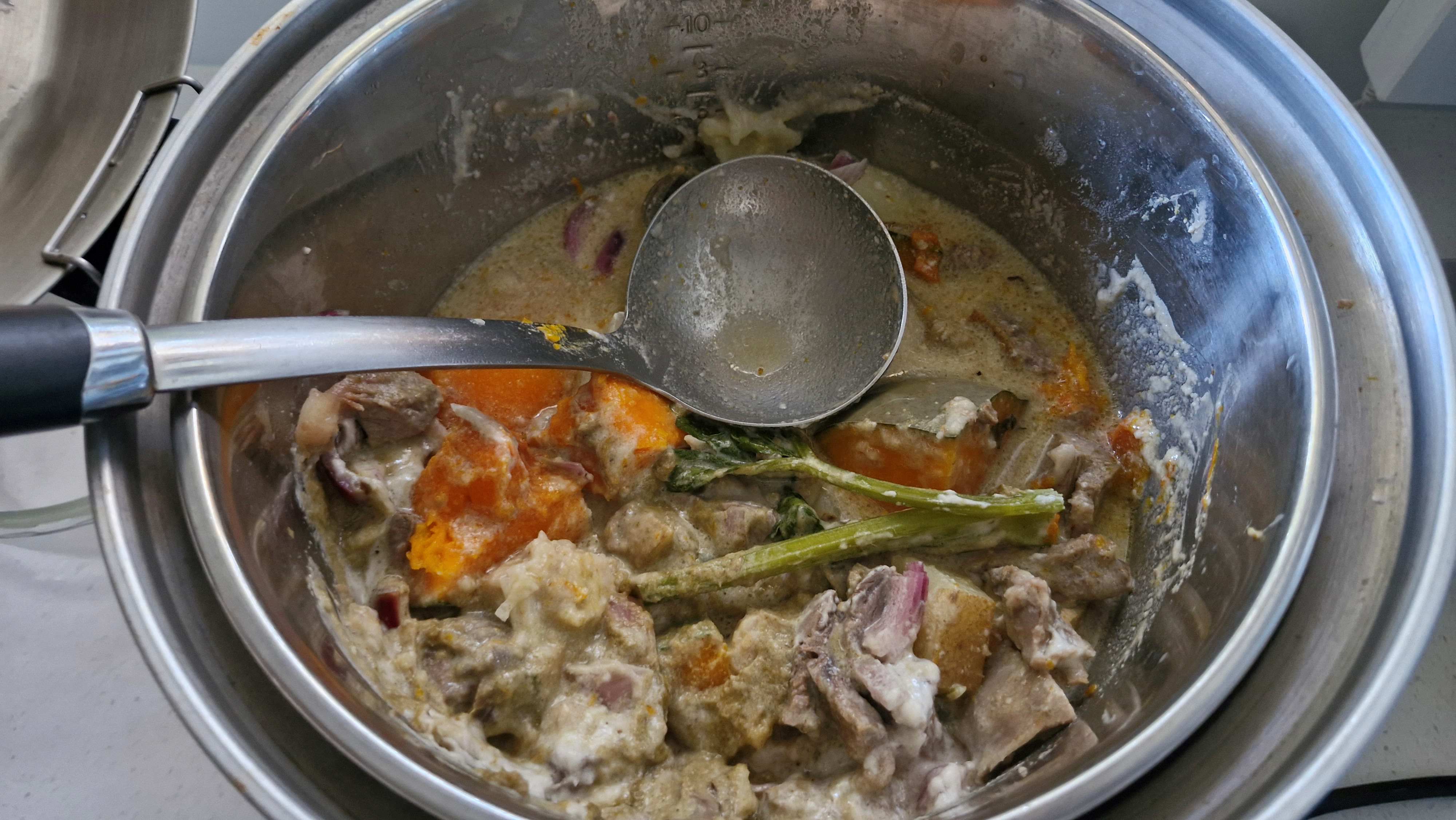 Potatoes, pumpkin, celery, lamb, cococut milk and curry!