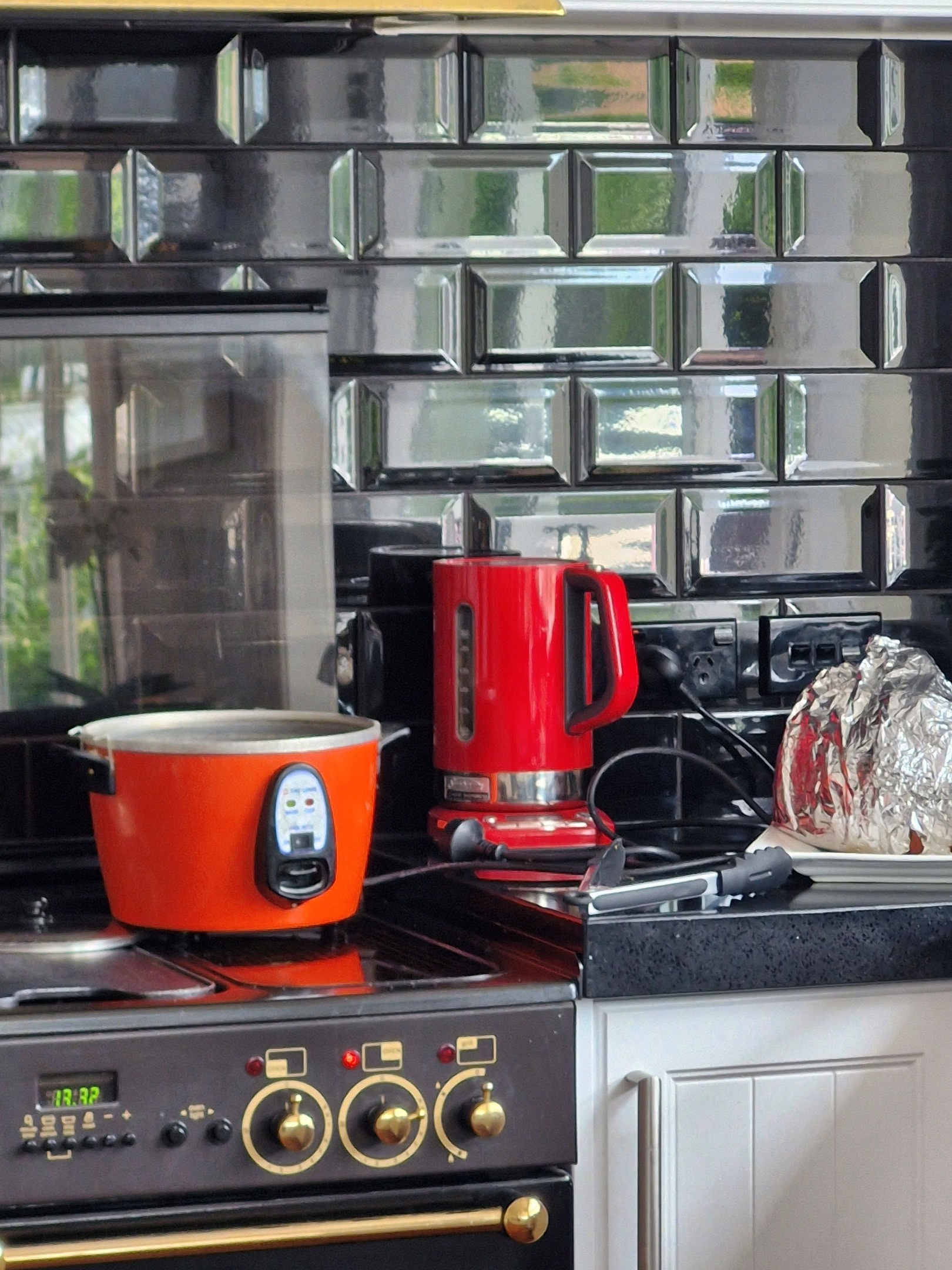 I was at my friend's house for a wonderful ham lunch and she had rice as a side dish and I thought her red Tatung rice cooker and red kettle worked really well with the black tiles in the back ground. Very stylish.