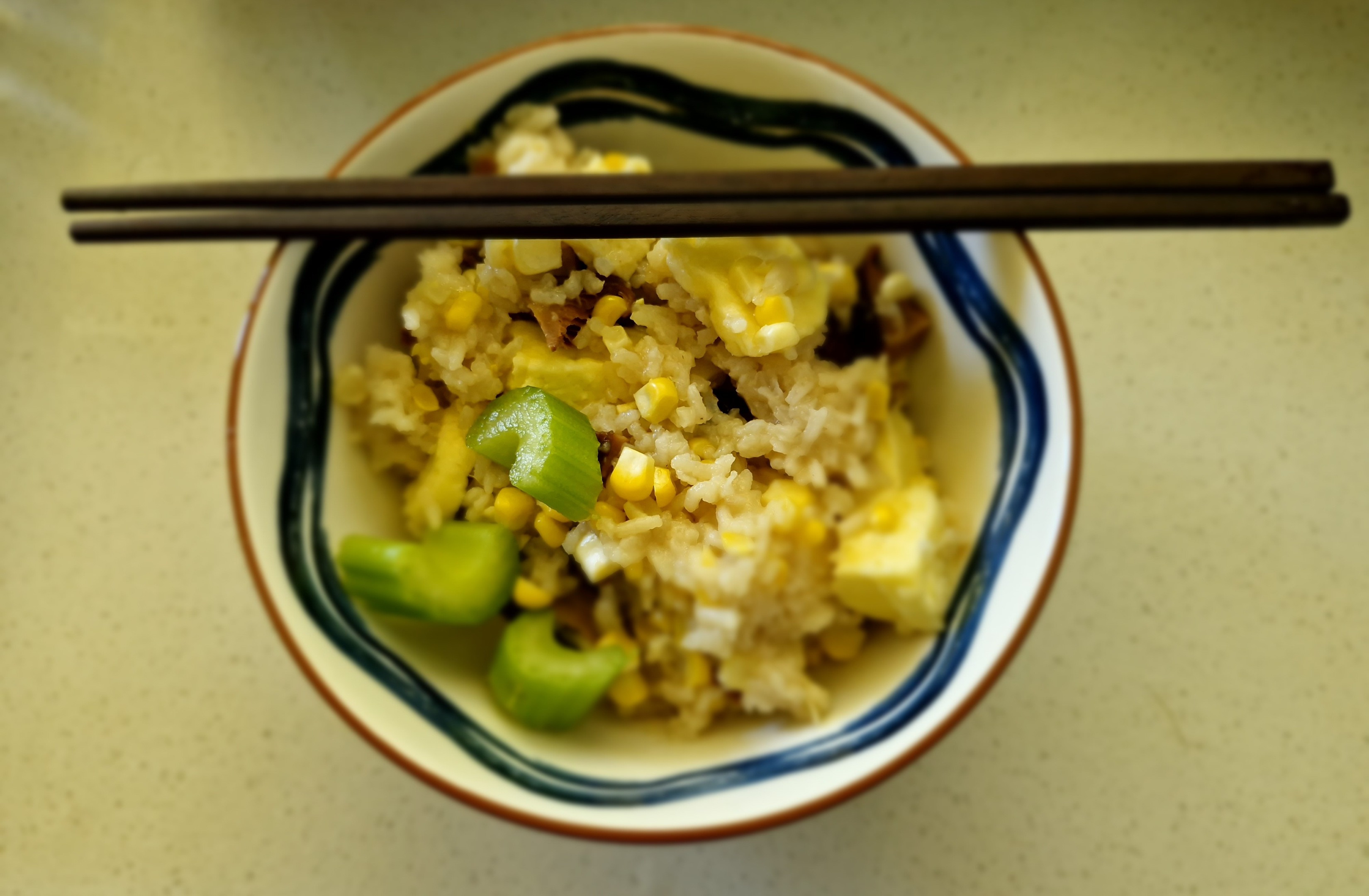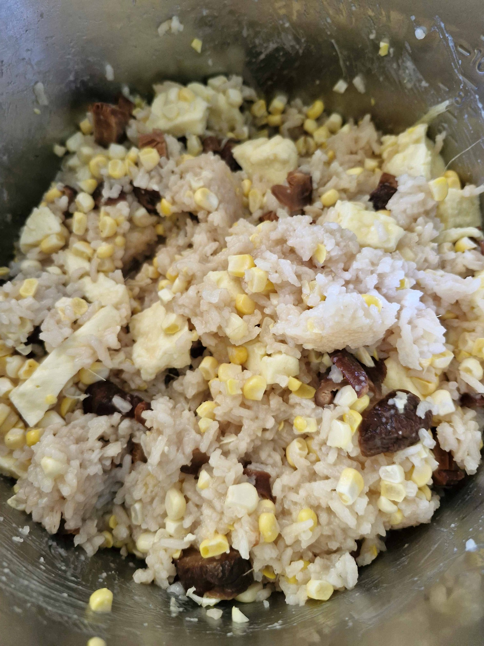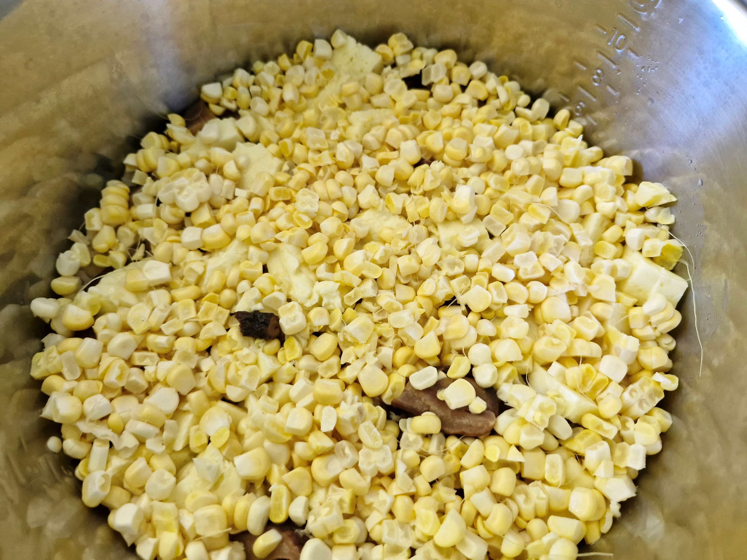 I like my corn with just cooked, I often eat it raw so I cut it off the cob and mix it in with the rice that had the shiitake mushrooms cooking in it. The heat from the rice and mushrooms is enough to cook the corn.