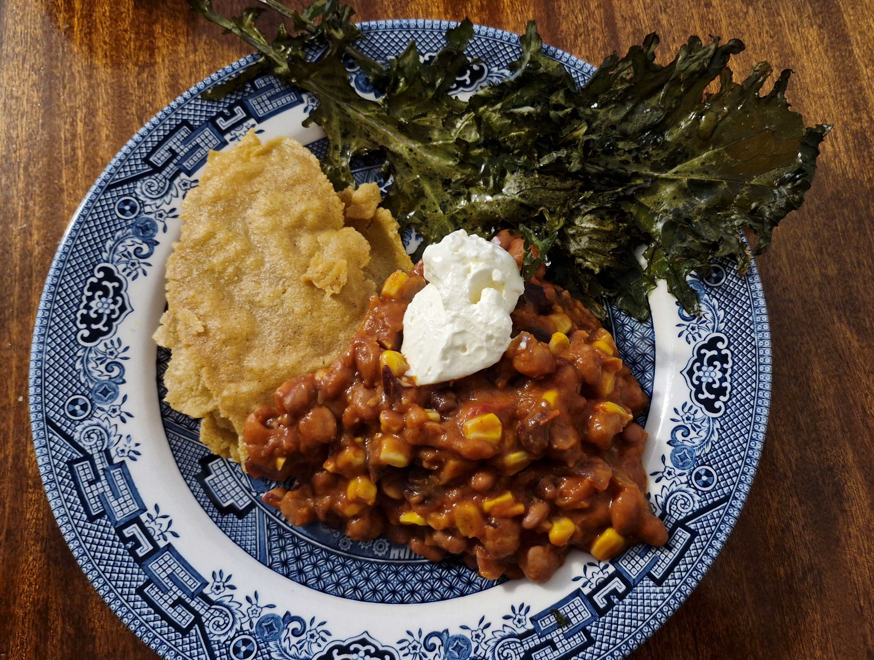 We grew our fresh kale, made corn chips from masa flour and we soaked the beans and cooked them in the Tatung Stainless Steel Rice cooker.