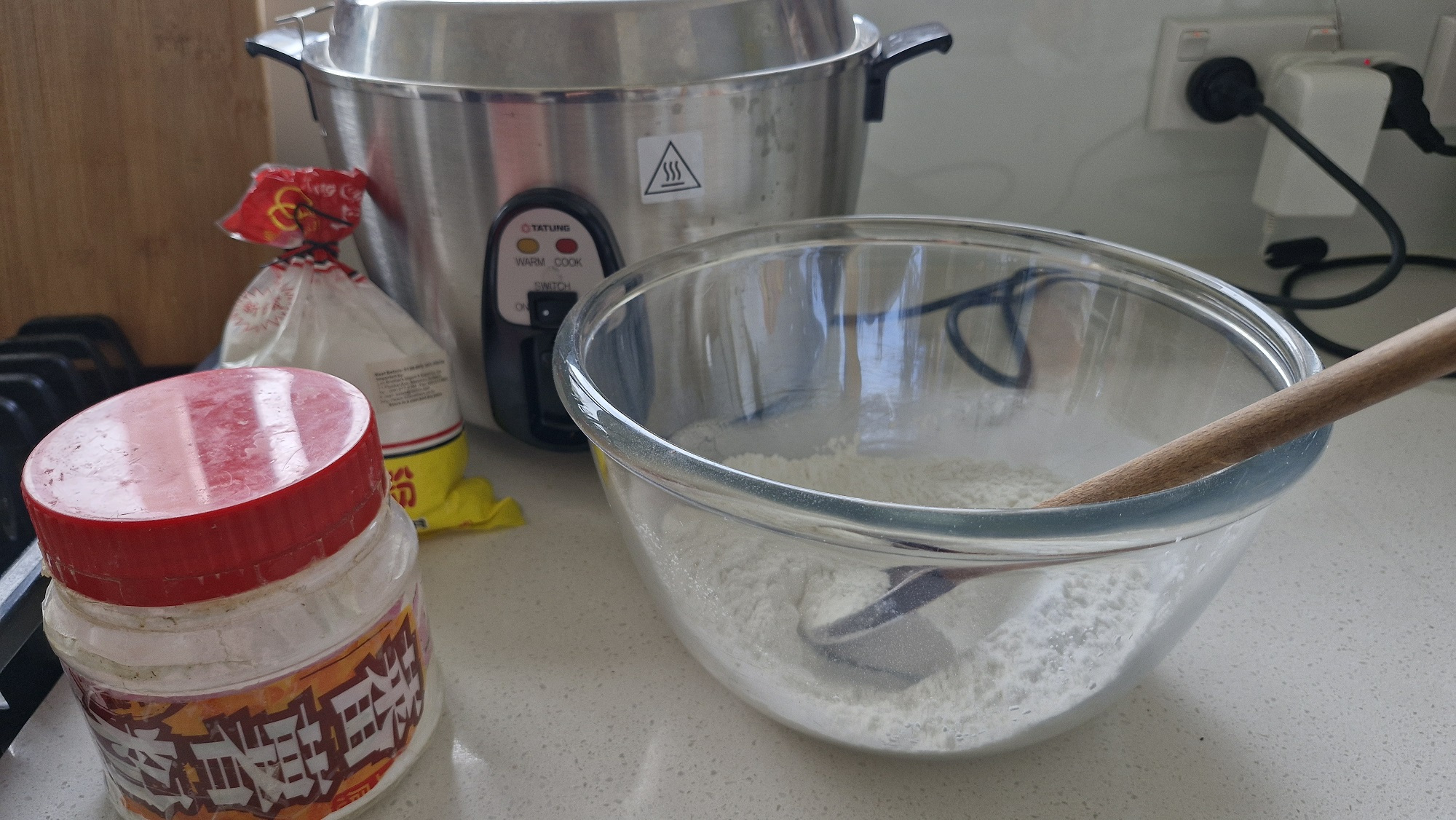 Rice flour and tapioca flour - mix; add water and kneed - you can do this for 5 mins or kneed for a minute and then add the water and let it sit at least an hour or overnight to hydrate the starch.