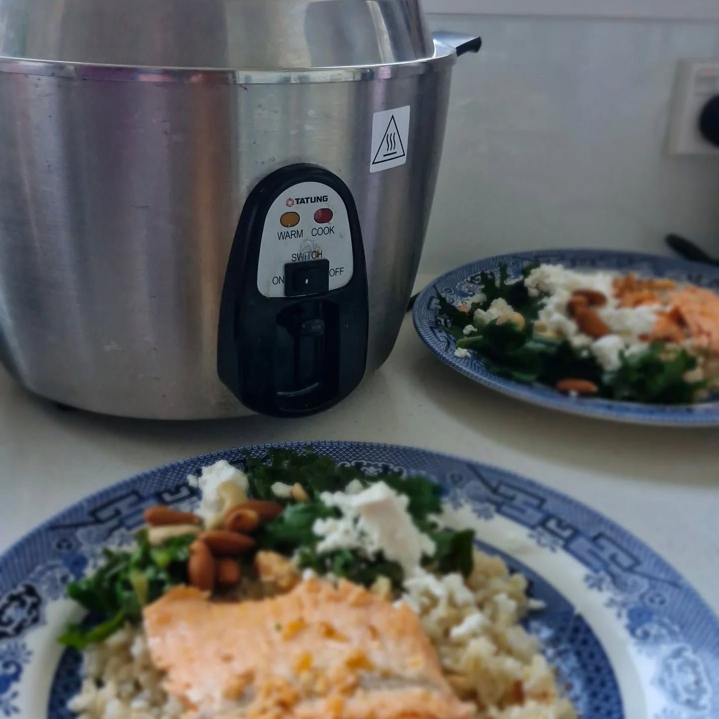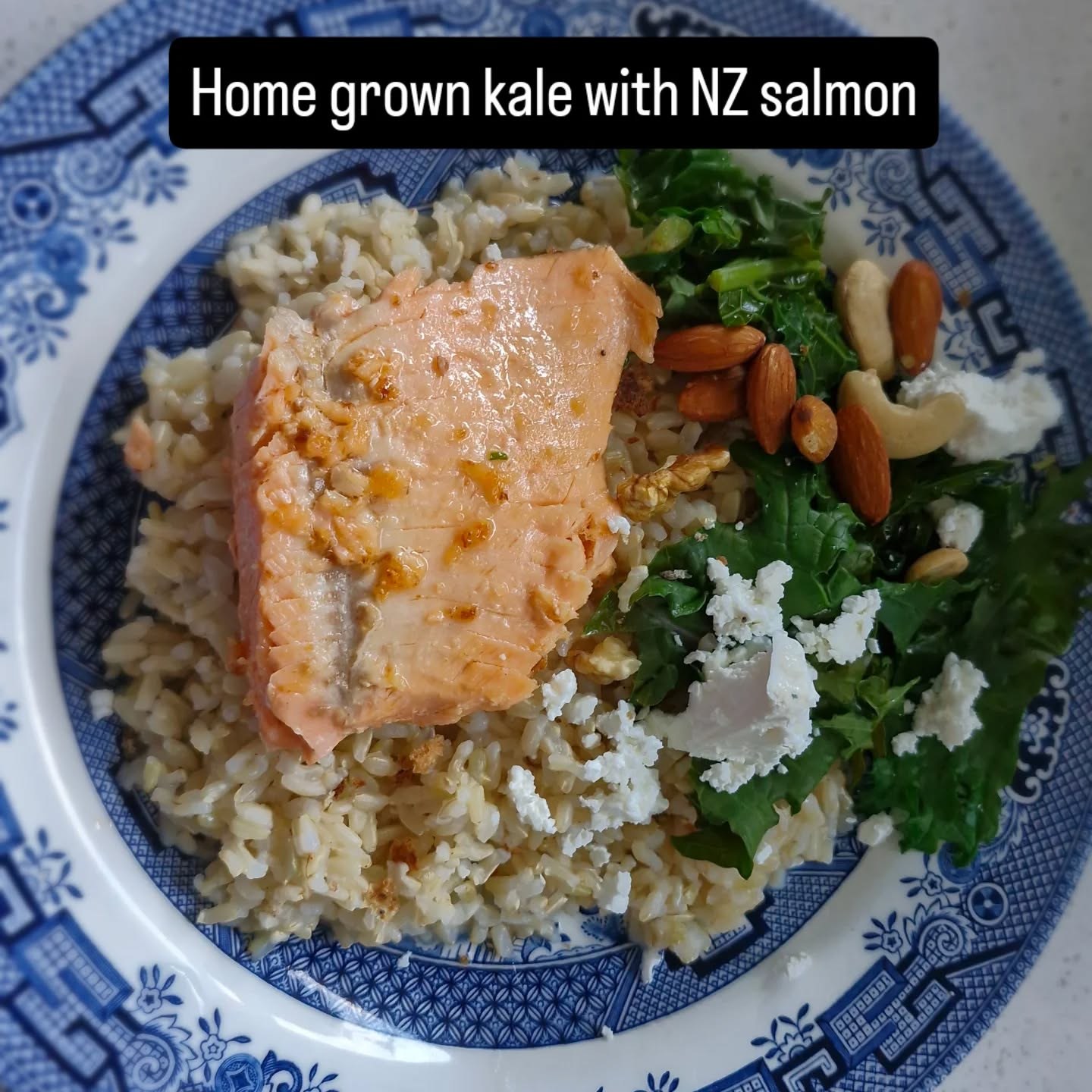 Nutty flavour of brown rice.  NZ salmon cooked with butter and garlic.  Home grown kale, feta and nut salad!